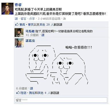 司馬懿嚇得回應:「陛下,臣冤枉啊!!一切都是蘋果日報記者亂寫的。」司馬懿的確是三國時曹魏的政治家,一生效命曹操、曹丕、曹叡和曹芳,最著名的功績就是多次率領大軍對抗諸葛亮的北伐。結果,卻「被陷害叛變」啦!這回諸葛亮扳回一城,開心地在司馬懿臉書上用「顏文字」嘲笑他。