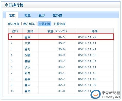 「逢五逢十是大數,留個紀錄!今天,熱!很曬.......溫度還會更高!」中央氣象局預報中心主任鄭明典14日在臉書PO照,指出台北地區溫度在接近中午時刻已經飆到35度,也指出台東地區也已經出現36.5高溫,容易有焚風發生,有可能影響果樹栽培區。