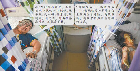 昏迷的鄧良珍被送到醫院搶救,醫院連發了多次病危通知。醫生指出,老人全身40%的面積燒傷,加上吸入較多濃煙,隨時有生命危險。而李安雲全身有16%的皮膚被燒傷。