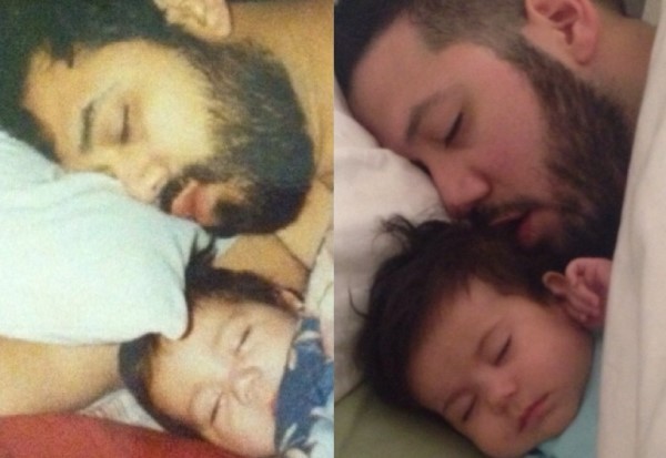 根據照片,「爸爸」都抱著男嬰入睡,兩張圖中父子的長相和動作幾乎一模一樣。網友驚呼「好強大的基因啊!」還有人搞笑接力挑出兩張圖片相同之處,包括「黑頭髮」、「圓臉頰」和「白枕頭」。