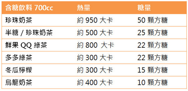 「那不喝全糖,改喝半糖好了!」許多民眾都是這個想法。全糖的糖量是非常嚇人沒錯,但半糖仍舊驚人。700cc半糖珍珠奶茶也有500大卡的熱量,需要騎車3小時才能消耗掉,減重者不可不慎!