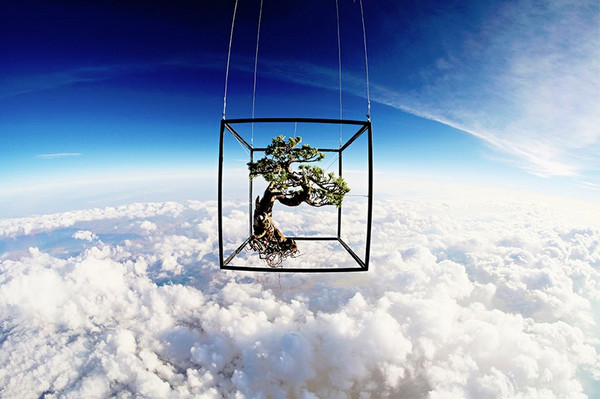 升空的作品包含一顆50歲的日本五針松盆景以及一束色彩繽紛的美麗花束,它們乘著氦氣球耗費100分鐘飛到近3萬公尺高空,在氣球爆炸後,用40分鐘以降落傘回到地面,過程都被極限相機拍攝下來。