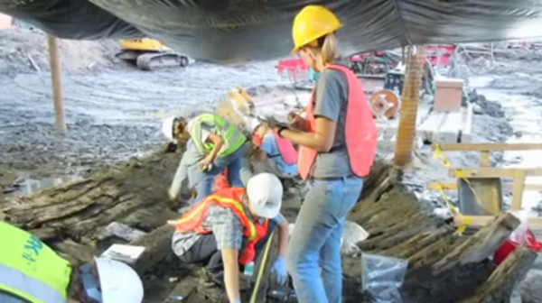 ▲紐約世貿遺址下出現的船體殘骸,疑似18世紀運行於哈德遜河的單軌帆船。(圖/達志影像/路透社)