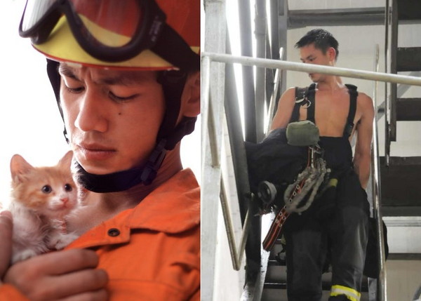 浙江杭州消防大關中隊的消防員葉豪傑,在中隊門口的梧樹上發現一隻受困的小貓,他沒多想,直接上樹,小心翼翼地救下小貓。這一幕恰好被女記者吳晨(微博名「左生」)直擊,拍下過程貼上微博,吸引網友追捧瘋傳,稱這是「萌貓硬漢」的組合,「被消防硬漢帥哭!被貓咪萌哭!」