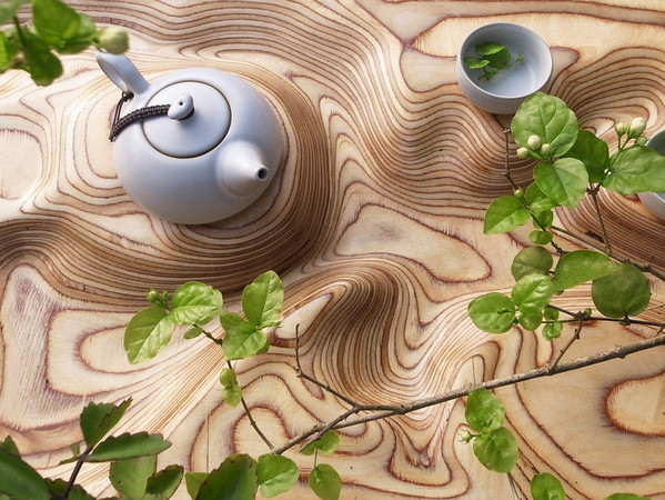 由香港ARTONOMOS工作室設計生產的茶具托盤「Confluence (匯聚)」,一眼看似凌亂的木紋其實是以山水地形為主題的茶具托盤,將木紋呈現為等高線緊密與疏散的效果,表現出了山丘與谷地的地形特色,而茶托實際上也具有高低的落差,無論是平面或立體,都在這Confluence茶托上表現出如同山丘起伏般的美麗地貌景觀。