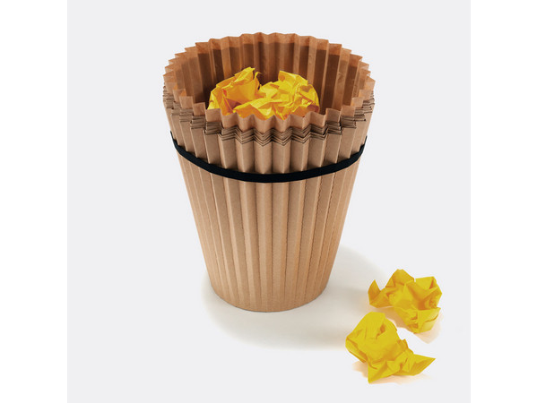 兼具環保概念,由回收再生紙所製作的多層設計,外圈由彈性的鬆緊帶固定多層的內裡,因為是紙製的,無法丟棄含水的垃圾,否則會破壞整個垃圾桶。