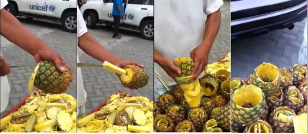 影片中,鳳梨攤商先將鳳梨去頭去尾,緊接著刀子沿著果皮刮下一層皮後,果肉切幾刀,這時中間的鳳梨心就輕而易舉的挑出來了。神奇的不只如此,橫放鳳梨再切數刀,直接往塑膠袋裡倒,鳳梨塊竟全數脫落果皮,輕鬆入袋,最後還來個還淺淺一笑。