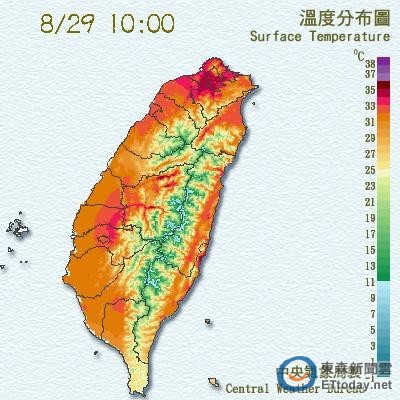 氣象局表示,在溫度方面,各地依舊高溫炎熱,預測中午前後的最高溫大多在33到35度之間,大台北地區更有機會達到36度左右;陽光強烈,紫外線指數容易達到過量或危險級,請民眾外出一定要做好防曬工作,並且多補充水分以防中暑。