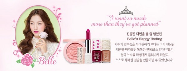 這次推出的彩妝是以迪士尼中的公主們作為發想,白雪公主款將「貼身情人~耀眼女神瓷妝BB霜」推出新包裝,提供最白的兩種膚色,象徵可以打造出如同白雪公主的雪白肌膚一般,搭配紅色的唇膏和指甲油,創造出如同白雪公主形象般的妝容。另外,灰姑娘系列推出3款棕色系眼影搭配藍色指彩、貝兒則以成熟感暗紅唇彩搭配橘系腮紅等組合,製造出公主般的夢幻感彩妝。