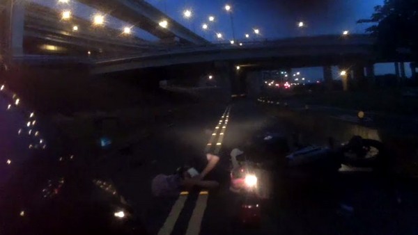該名騎士因受到高速的衝擊,整個人橫躺在地,不停地喘息,東西也散落一地,後方目擊騎士也趕緊下車看情況,並幫忙打電話叫救護車。整個誇張過程被行車記錄器記錄下來,影片一PO上網路,網友紛紛在底下留言「走這種堤外機車道,根本是冒險」、「路邊機車連燈都沒開,天色昏暗真的看不到」、「那個位置常遇到有人直接停車在路邊」、「那條機車道真的很危險。」