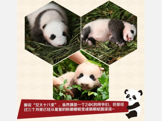 這隻已經3個月大的小貓熊是位可愛的「小男生」,牠的媽媽是曾經在2008年汶川大地震後產下全球第一對雙胞胎貓熊寶寶的「幗幗」,目前體重已經達到約4.6公斤重,但還不能夠自己爬行,還需要靠母貓熊照料吃飯跟喝水。