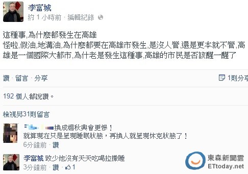 ▲李富城:高雄是一個國際大都市,為什老是發生這種事?高雄的市民是否該醒一醒了。(圖/取自李富城臉書)
