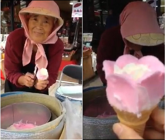 對著鏡頭親切的微笑,畫面中這名在秋田角館街道擺攤、年約80歲的阿嬤,將白色冰淇淋裝在甜筒後,便用挖勺把粉紅色的冰片成花瓣造型,頓時再平常也不過的叭噗,立刻變身法國超夯的「花朵冰淇淋」。雖然必須花點時間等待,每支賣你200日圓(約台幣57元),但PO影片的許小姐表示,現場幾乎人手一支。