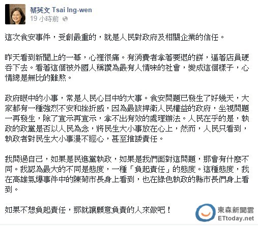 ▲蔡英文在臉書表示政府對食安問題推諉責任,應該讓負責任的人來做。(圖/翻攝自蔡英文臉書)
