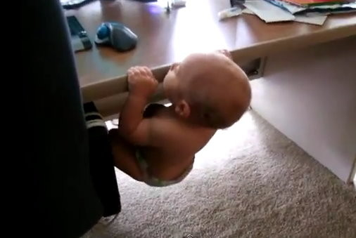 如果日本電視節目《極限體能王》仍繼續播出,鐵定得留意這個9、10個月大的嬰兒!影片中,「極限體能娃」喬納斯(Jonas)雙手抓住電腦桌緣,仿照拉單槓的動作「引體向上」,還連續做了好幾下。據影片上傳者表示,喬納斯其實是想要湊近電腦一些,觀賞正在播放的《森林王子》。