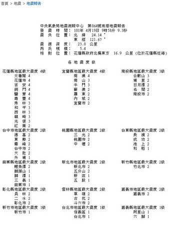 中央氣象局地震測報中心指出,花蓮地區在19日上午9時58分發生芮氏5.4的有感地震,震央在花蓮近海,地震深度為23公里,震度4級地區包括花蓮市、太魯閣、宜蘭南澳;震度3級為南投合歡山,其它各地多為震度2級與1級不等,台北市為震度1級,但民眾感受為上下震動。