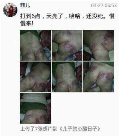 根據《新快報》報導,這名鍾姓男子網路暱稱「菲兒」,今年3月開始不斷上傳男童屁股瘀血、流鼻血的照片,並將系列照片命名為《兒子的心酸日子》,鍾男甚至還在貼文中表示,「快要死了,已經是自動出血了,又胡言亂語了哈哈。」、「打到6點了,天亮了。哈哈,還沒死。慢慢來!」