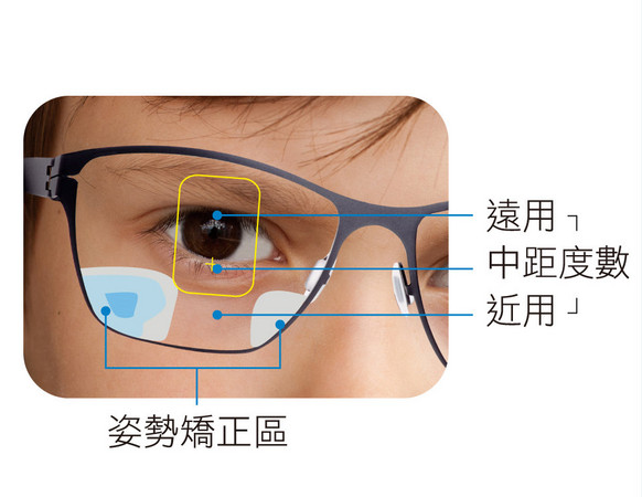 ▲遠中近視力,3合1鏡片一付搞定,鏡片下方的姿勢矯正區,有助調整用眼角度及姿勢。(圖/業者提供)
