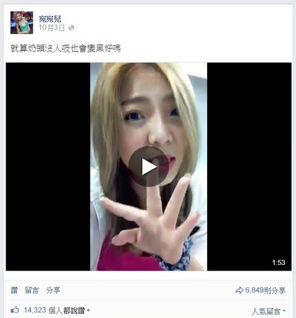 ▲正妹宛宛兒在臉書PO影片為女性朋友澄清,就算奶頭沒人吸也會變黑。(圖/翻攝自宛宛兒臉書)