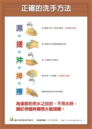 ▲ 預防腸病毒,正確洗手5步驟「濕‧搓‧沖‧捧‧擦」。(圖/取自衛生局)