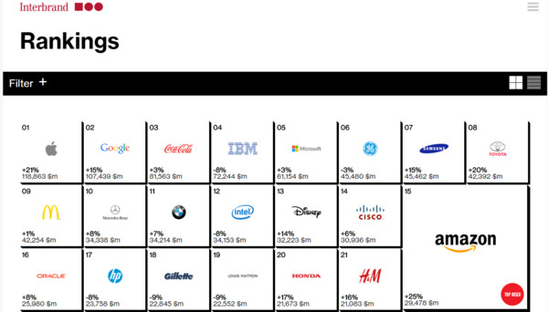 Interbrand以3項指標計算企業品牌價值,分別是「企業財務表現」、「企業對消費者影響力」、「企業對社會的貢獻」,此一方法並經國際標準化組織(International Organization for Standardization)認證,具一定參考價值。