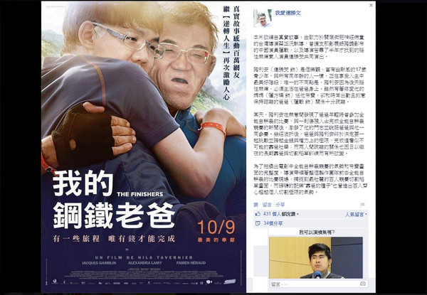 《我的鋼鐵老爸》(The Finishers)是一部敘述一名患有先天腦性麻痺的少年與父親參加鐵人三項賽事的感人電影,過程中兩人疏離的關係經由長期的賽事訓練而改變,這個真實的故事先是感動不少網友,之後才拍攝成這部電影。