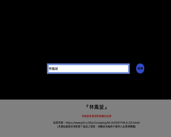 「什麼!林鳳營鮮乳也是頂新集團的」!?如果您也有以下困擾,想要加入全民「滅頂」行動,卻又不小心買了該公司商品,那一定試試網友特別精心製作的「頂新商品偵測器」,只要輸入關鍵字,系統就會開始判斷,給出「林鳳營是個頂新集團的品牌」、「瑞穗鮮乳放心買,沒問題的」等等答案。