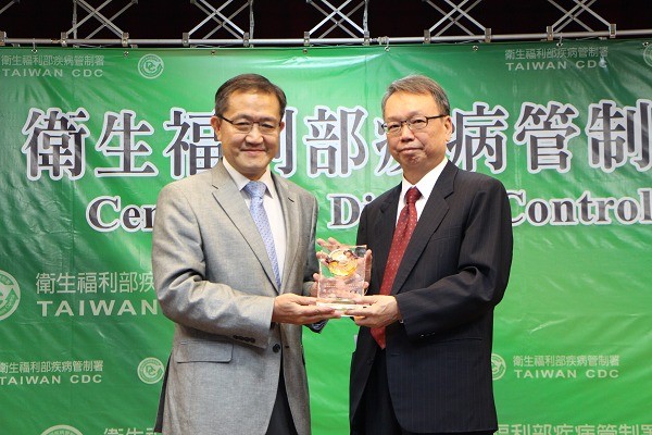 ▲疾病管制署郭旭崧署長(左)致贈感謝獎座予台塑關係企業總管理傅陳卿資深副總經理(右)。(圖/疾病管制署提供)