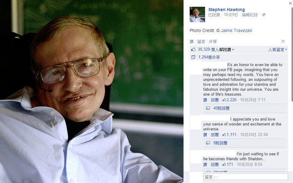 被新聞媒體譽為「愛因斯坦之後最傑出的理論物理學家」的史蒂芬.霍金(Stephen Hawking),在今年10月7日正式使用臉書,不僅在動態上大開自己用機器發聲像外星人的玩笑,連臉書創辦人馬克.祖克伯(Mark Zuckerberg)都光臨按讚,更有網友驕傲表示「霍金把臉書『平均智商』都拉高了」!