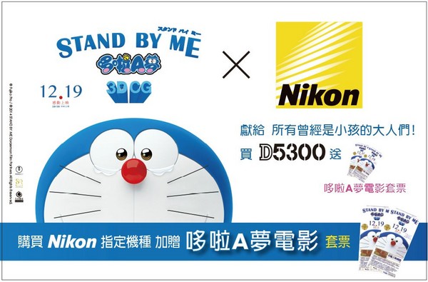 相機大廠 Nikon 台灣總代理國祥貿易宣布,繼 Nikon 於日本與《STAND BY ME 哆啦 A 夢》電影合作之後, Nikon 台灣也將率先推出買相機送限量電影套票活動。凡於 11 月 1 日起至 11 月 28 日購買 Nikon D5300 / D3300 / Nikon 1 J4 / P600 即可優先獲贈《STAND BY ME 哆啦 A 夢》電影限量電影套票 2 張。