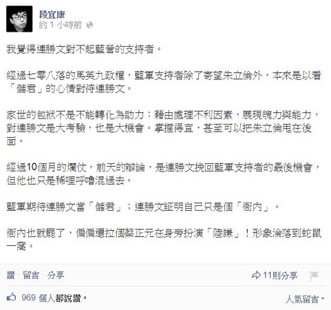 段宜康表示,馬英九政權後,藍軍支持者除了寄望新北市長朱立倫,還將連勝文以「儲君」看待,但經過10個月的爛仗,連還將前天的辯論「稀哩呼嚕混過去」,失去挽回選民的最後機會。
