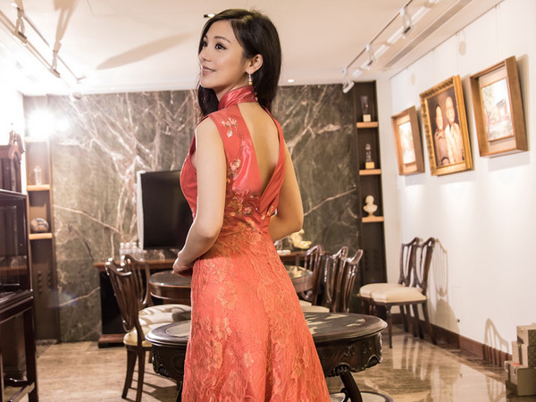 禮服從設計到選布、試衣耗時近兩個月,珊瑚紅絲緞搭配近十米法國金蔥蕾絲,中式立領加上露背剪裁,襯托吳依潔的白皙膚色,氣質端莊美炸不愧身為女神級主播。