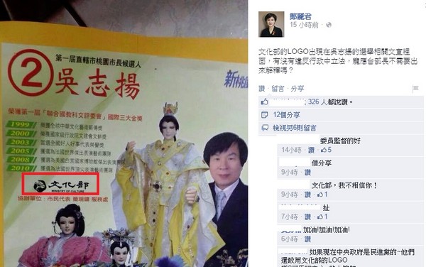 吳志揚桃園競選總部日前宣布邀請明華園歌仔戲及廖文和布袋戲,分別於15、16日在桃園市青溪、陽明公園表演,不過活動宣傳海報上卻寫著「桃園媽祖文化祭」以及印有文化部標誌;鄭麗君表示,「文化部的LOGO出現在吳志揚的選舉相關文宣裡面,有沒有違反行政中立法,龍應台部長不需要出來解釋嗎?」