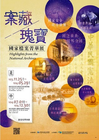 檔案是珍貴的國家資產,不僅見證政府施政歷程,也忠實地刻劃出國家發展與人民生活的軌跡。為彰顯國家檔案的功能與價值,串連全民記憶,首度由國家發展委員會指導,國家發展委員會檔案管理局及國史館臺灣文獻館主辦的「案藏瑰寶-國家檔案菁華展」,從典藏長度超過30座臺北101大樓高的國家檔案中嚴選出70則精粹檔案,將於103年11月25日起在行政院新莊聯合辦公大樓北棟1樓隆重展出。
