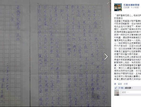 ▲陳男受到警方幫助,返家用稿紙寫信感謝。(圖/翻攝自花蓮洄瀾新聞雲粉絲專頁)