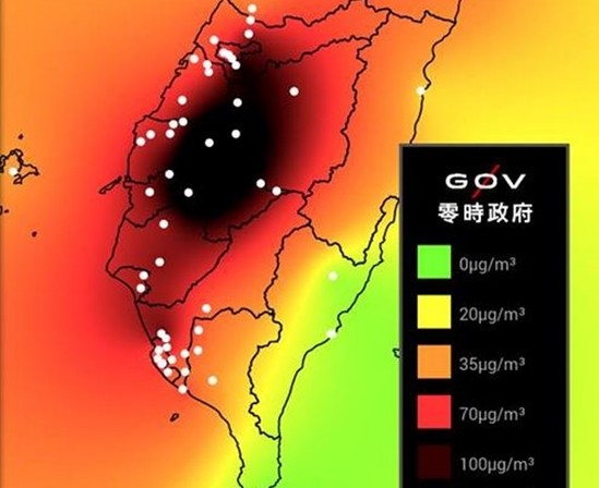 一名住在南投的網友Cynthia Su在臉書記錄,25日上午8時至晚間10時的細懸浮微粒(PM2.5)濃度變化狀況,發現雲林、彰化地區入夜後,PM2.5濃度突然飆升,並且逐漸往南投、嘉義方向擴散,形成「大黑丸」。