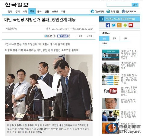 九合一大選國民黨慘敗,全台22縣市只拿下5個,六都甚至只剩下新北市,而且還只以兩萬多票的差距險勝,韓國各大媒體30日都將此新聞放在國際版頭條,《東亞日報》以「台灣選民對親中的國民黨亮黃牌」作標題,其他媒體也都以兩岸關係、國民黨親中為切入角度。