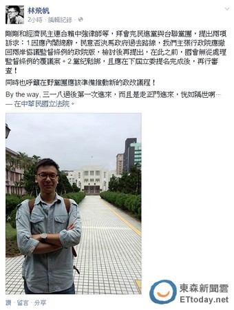 今年三月太陽花學運寫下歷史新頁,這場學生運動冒出頭的新生代領袖林飛帆,在事隔7個半月後再次踏入院內,而且還是用「走」的進來,他與經濟民主連合賴中強律師拜會民進黨與台聯黨團,並提出兩項訴求,也感嘆「 三一八過後第一次進來,而且是走正門進來,恍如隔世啊。」