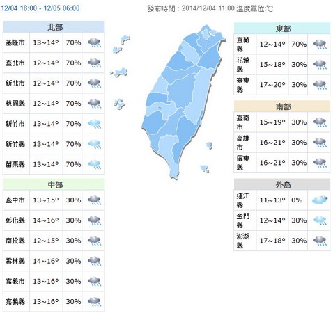 ▲今晚(4日18:00)至明天清晨(12/05 06:00)的天氣預報圖。(圖/取自中央氣象局)
