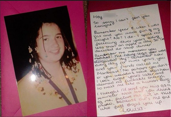 英國一名女大生曼寧(Louisa Manning)8年前曾被一群男生戲稱「肥豬」,此後她奮發減肥,現在成功蛻變為「正妹」。巧合的是,曼寧日前參加舞會時,竟遇到曾霸凌自己的男生,對方還提出邀約;她假意答應後放對方鴿子,並留下復仇字條。