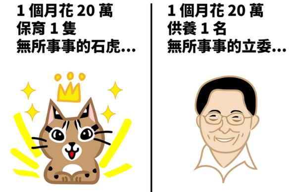 這幾天「石虎抱抱」張貼一張可愛圖片,上頭有石虎、立委,和一道選擇題。題目是,一個月花20萬元,「保育1隻1隻無所事事的石虎,或供養1名無所事事的立委?」該則訊息上更寫到,資源要花在刀口上,公民們拾起手術刀,陪石虎繼續支援「Appendectomy Project割闌尾計畫」。更有眼尖的網友發現,Q版的立委圖示,長的和「祭止兀」十分相像。