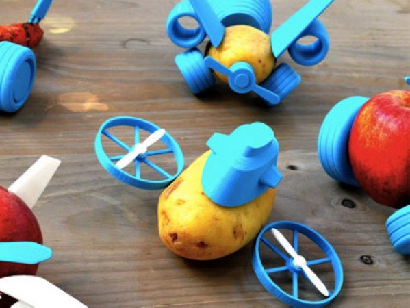 用 3D 列印機印製出的藍白色的螺旋槳、機翼、輪胎等等,讓蔬菜變得超級可愛!