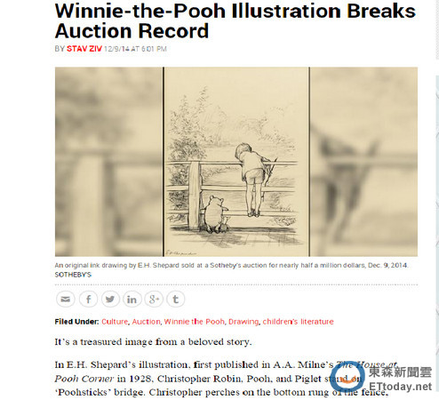 謝培德(EH Shepard)畫出的卡通人物「小熊維尼」風靡全球,插畫原稿「維尼木棍(poohsticks)」9日於倫敦以31萬4500英鎊(約新台幣1564萬元)拍出,創下書籍插畫類的最高拍賣記錄。