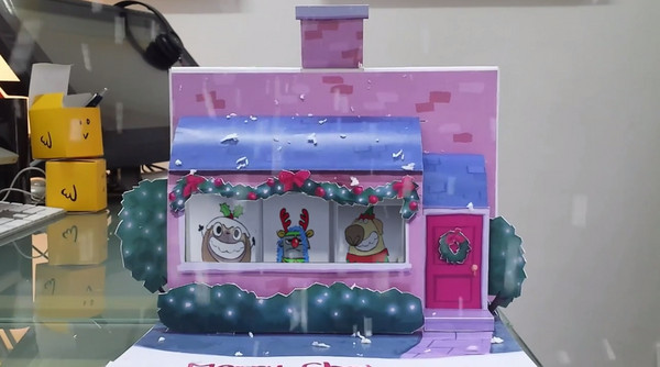 這張超生動聖誕卡片也被「Birdbox Studio」拍成影片上傳,不到一分鐘的片段卻讓人充滿驚喜,厚如一本書的卡片打開後,先看見一棟有窗戶、煙囪及聖誕布置的粉紅色房屋,接著隨著音樂旋律,窗內的3隻可愛動物開始唱歌,並漸漸換裝成聖誕服飾,但還沒完,歌曲結束後,從煙囪還爆出聖誕雪花。
