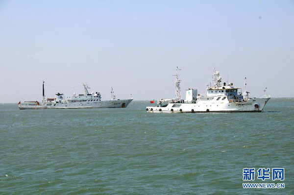 ▲10月11日,中國漁政202船在巡航執法途中,於浙江南部南麂島錨地與201船編隊4艘執法船會合。(圖/新華社)