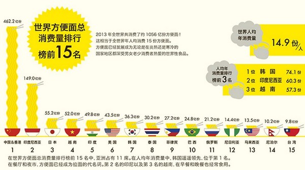 世界速食麵協會(WINA)日前公布一份調查,2013年全球泡麵購買排行榜中,以中國462.2億份奪得第一。不過中國人口基數大,若以人均購買量來計算,南韓每人一年平均吃下74份,遙遙領先其他國家,更遠超過全球平均的14.9份。
