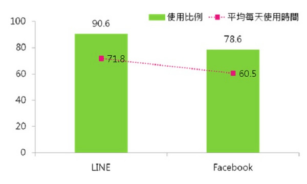 在眾多類型的APP中,使用者每日平均在LINE與臉書APP的時間,更分別長達71.8分鐘與60.5分鐘,都超過1小時。另外,習慣在智慧型裝置上完遊戲類APP的使用者,平均每天也都會花上52.6分鐘在遊玩遊戲上。