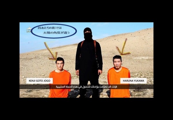日本幾名網友反覆播放影片後,發現2名人質明明在同一地點,但2人脖子附近的陰影方向明顯不同,再加上衣服擺動幅度也有落差,質疑影片可能造假。對此,有日本網友猜測,該不會2人被綁架的消息也是假的;不過也有網友認為,影片很可能經過後製,這是IS避免各國特種部隊從背景中找到線索,現在救人要緊,討論影片真假意義不大。