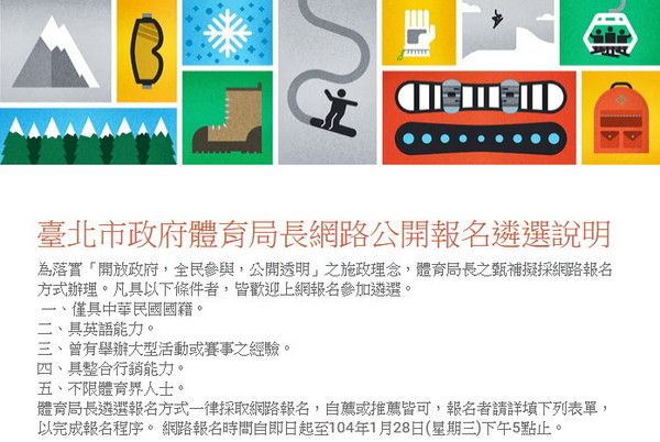 柯文哲在臉書指出,北市體育局長一上任將面臨2017年世大運的艱困任務,也因此全世界都在期待。柯P表示,他需要具備英語能力、曾舉辦大型活動或賽事,而且還有整合行銷能力的人出任,但不一定要體育界人士,期盼符合條件者能一起加入市府團隊,共同為台北市民努力,報名時間至1月28日下午5時截止。