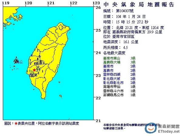 24日下午3時15分,在台南官田發生芮氏規模4.5小區域有感地震,地震深度16.1里,南部地區最大震度為3級。中央氣象局地震報告指出,震央位於嘉義縣政府南偏東方29.9公里海域,深度為16.1里,台南市、嘉義縣最大震度3級、嘉義市區、雲林縣、彰化縣2級;高雄市、澎湖縣1級。